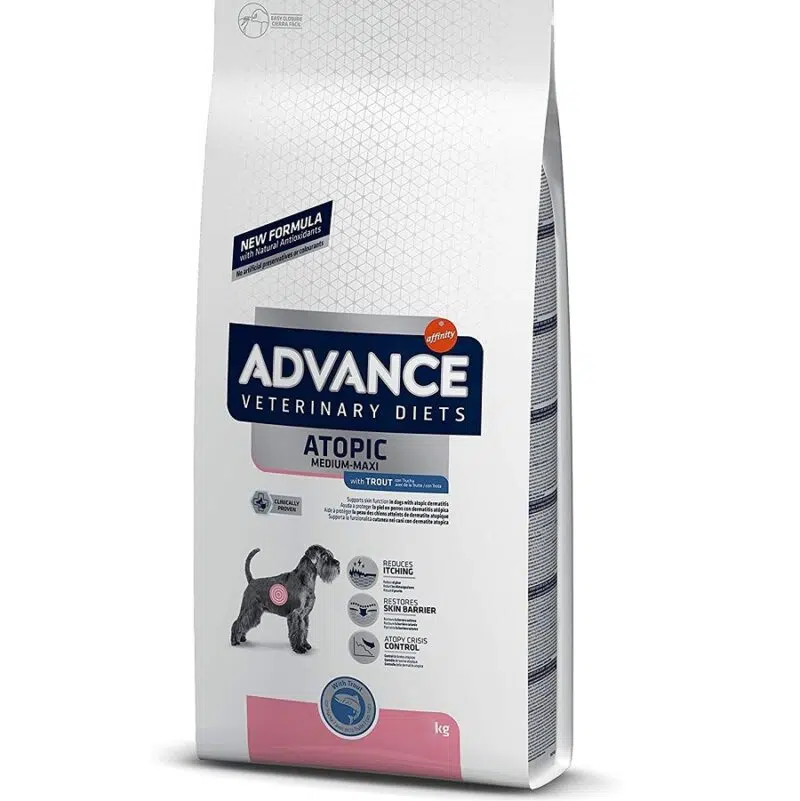 Advance atopic veterinary or prescription diet comes from the house of Affinity Spain. It is a premium derma diet for dogs and puppies of medium maxi breeds suffering from skin and coat disorders like atopic dermatitis. It provides relief from atopy and helps lessen incidents of allergy. It also decreases the chances of food allergy or food sensitivities by its hypoallergenic formula formula. This diet is rich in omega 3 & 6 fatty acids and restores the atopic barrier as well as helps reduce excessive itching. It incorporates trout and potato as the primary source of protein and carbs ?V thus decreasing the allergenic potential. Contains aloe vera to soothe the skin and olive leaf extract to maintain the skin barrier. Collagen peptides help improve skin and nails.